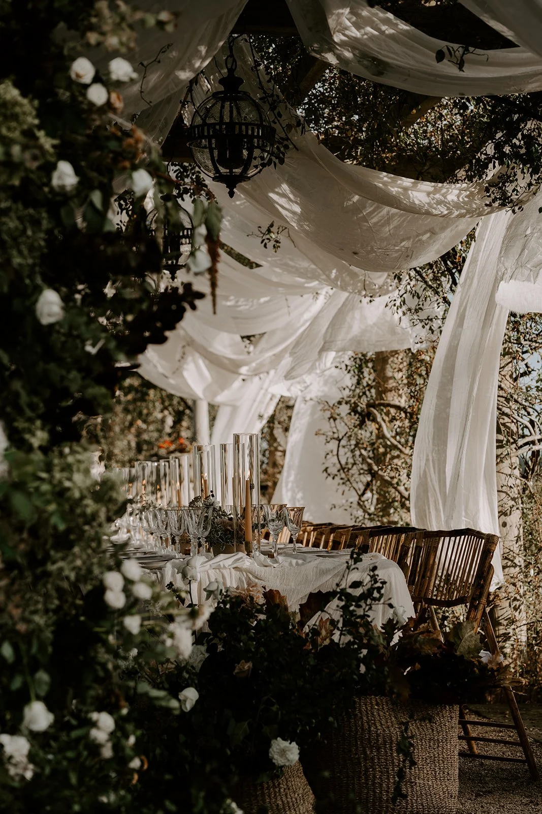 Simple fabric draped alongside the wild foliage throughout the pergola created an intimate and romantic setting; we chose pull a selection of warmer tones through the styling with peaches and nudes but still kept things modern and fresh.