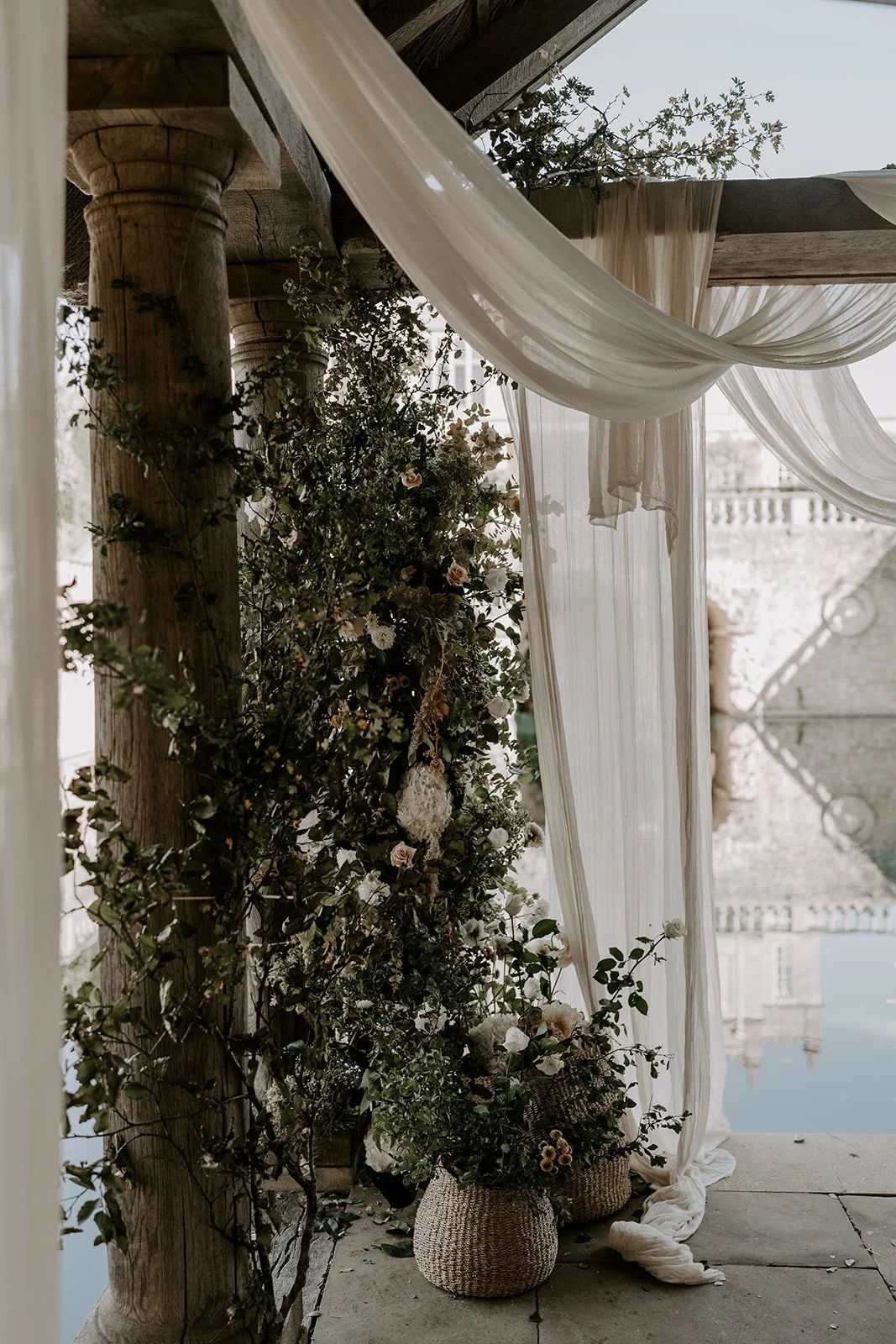 I wanted to respect the romantic setting of Euridge Manor but pay homeage to it’s ability to feel like a destination wedding venue. When planning the design I wanted to think about floating fabrics, wild foliages with an added Mediterranean touch.