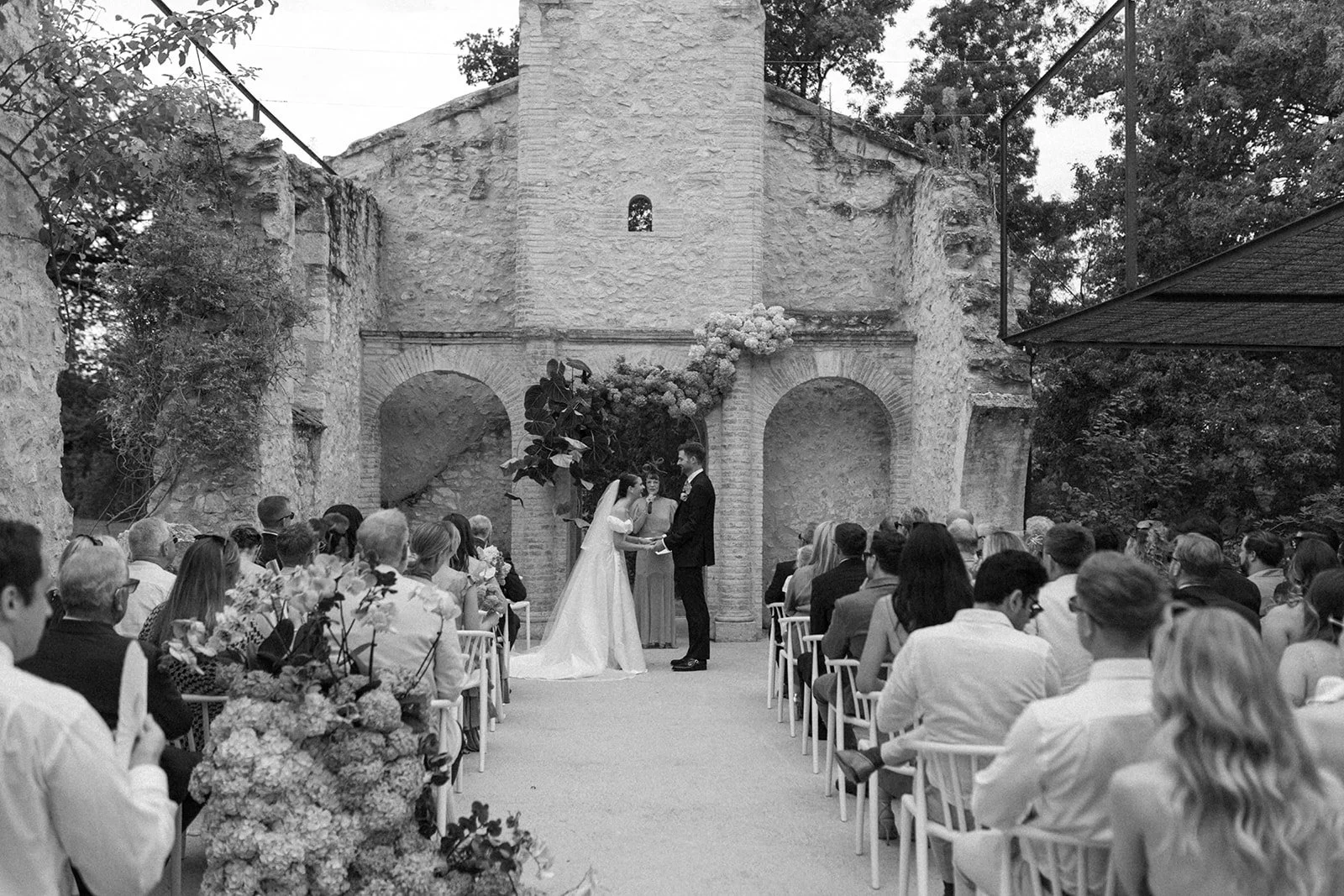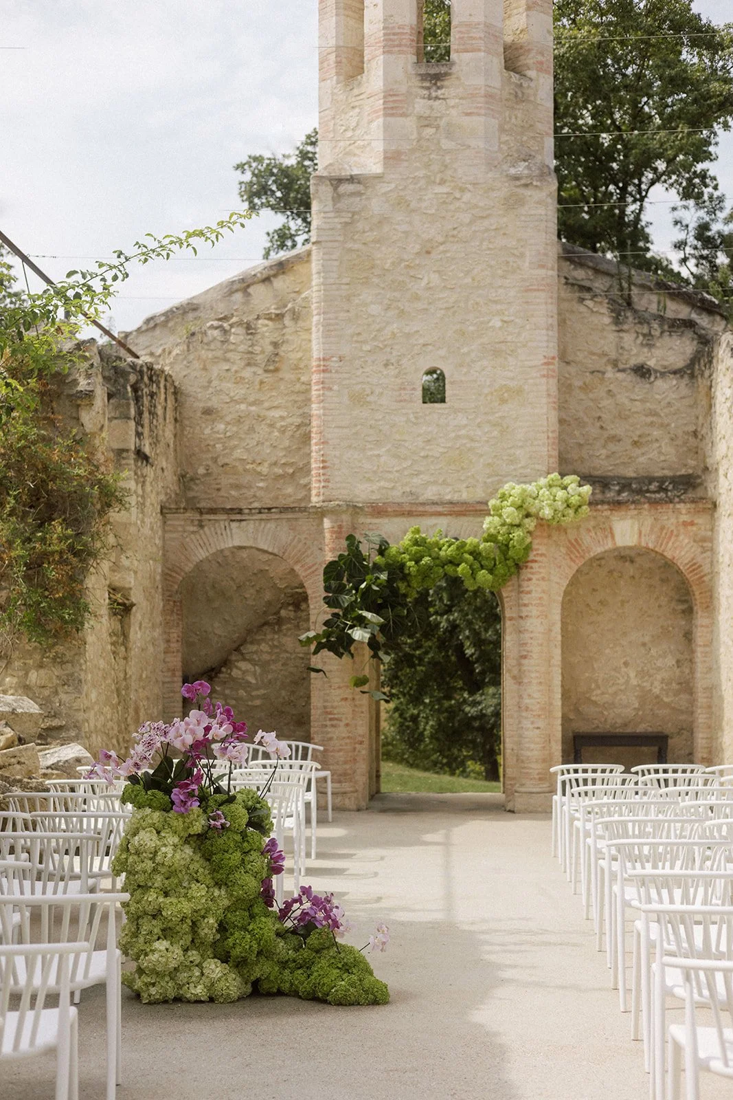 The 11th-century chapel, draped in roses and fragrant jasmine, is a captivating wedding ceremony location. Its striking architecture and stunning 360-degree views of the French countryside created the most unforgettable setting for our couple.