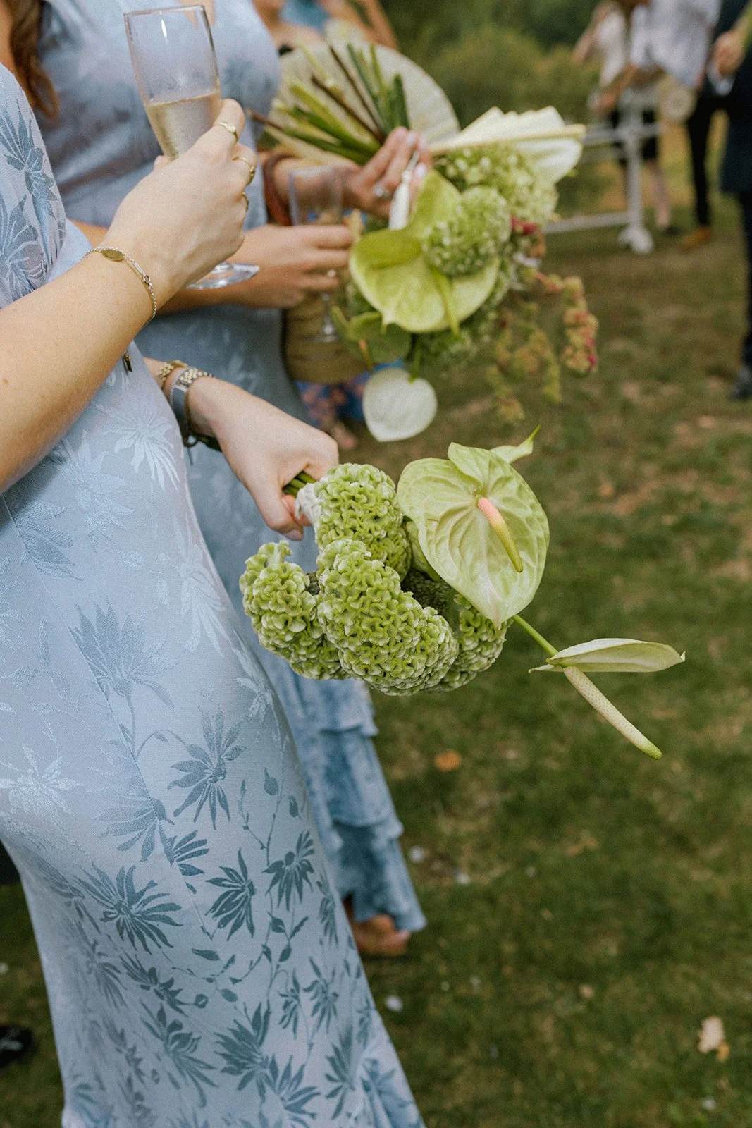The Bride looked breathtaking in a stunning Lihi Hod gown, the perfect choice for a romantic Chateau wedding in the South of France. Her bridesmaids, in patterned powder blue gowns, added a touch of playful color, especially when paired with the lime green blooms.
