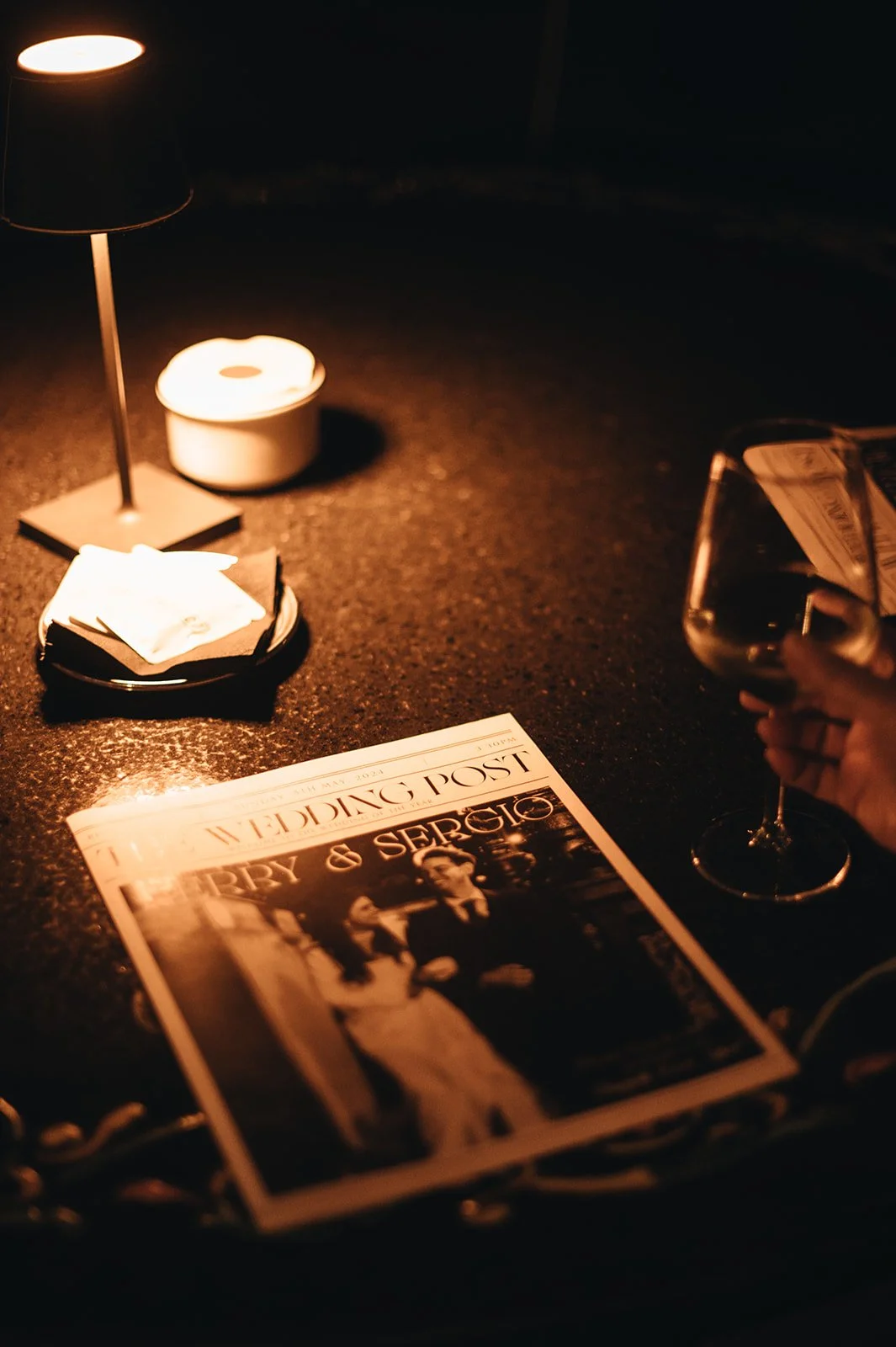 Wedding guests were welcomed to Palazzo Dama the night before the wedding - a perfect courtyard venue in the city centre. They enjoyed Mexican fusion food and cocktails poolside complete with custom newspapers gifted by the couple.